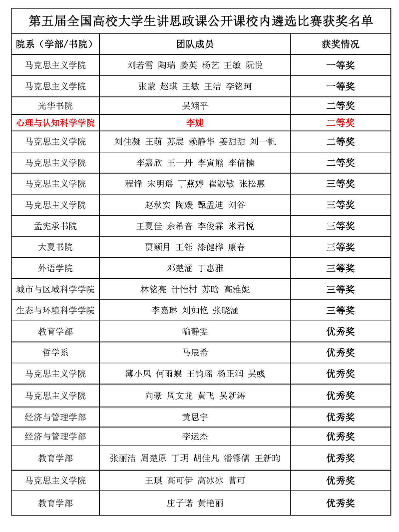 526日,第五届全国高校大学生讲思政课公开课校内遴选比赛在我校闵行校区举行。由庄瑜老师指导、2020级应用心理学专业学术型研究生李婕主讲的《中国青年与中国梦》公开课获得二等奖。