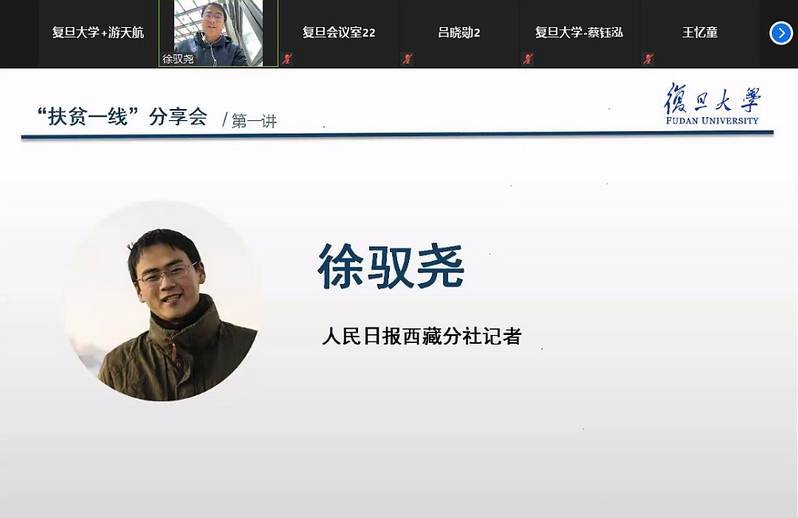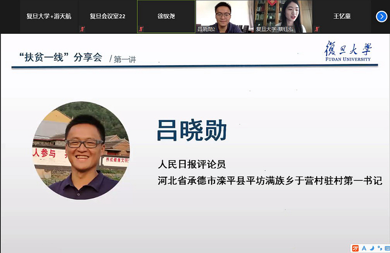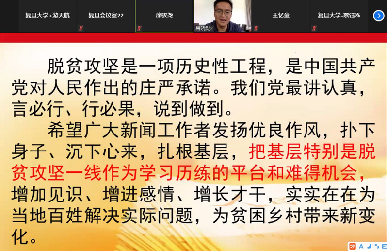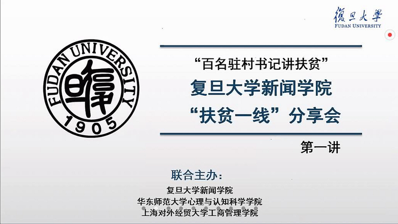 5月26日下午,肉视频 党委与复旦大学新闻学院党委、上海对外经贸大学工商管理学院党委以线上会议的形式联合举办“百名驻村第一书记讲扶贫”扶贫一线分享活动。来自三个学院210余位学生党员参与了此次活动。