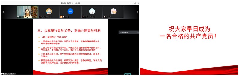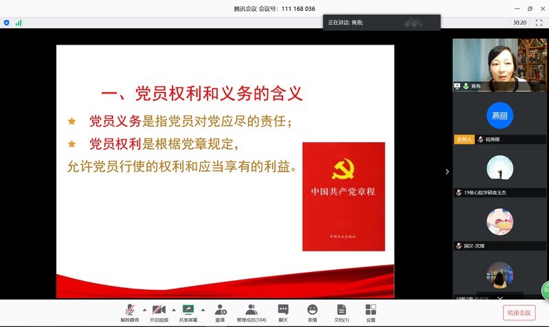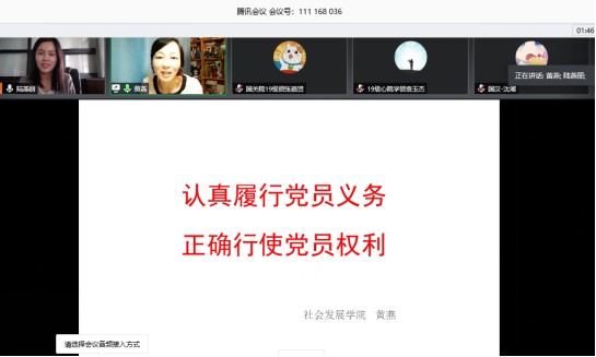 2020年5月6日下午,国际关系与地区发展研究院、肉视频 和国际汉语文化学院2020年入党积极分子联合培训班第六次培训依托腾讯会议平台在线上举行。肉视频 社会发展学院党委副书记、副院长黄燕教授为学员们带来专题讲座《党员的权利与义务》,来自三个学院的一百多名入党积极分子参与了此次培训。