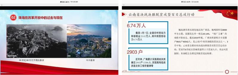 邓文静、诸淑芬等4位同学,联系过去与现在,将爱国主义精神贯穿于抗日战争、解放战争、改革开放和抗疫战疫等重要时期。诸淑芬和张晨共同介绍了他们在家乡广东省珠海市开展的社会调研,展示出改革开放40多年来人民生活不断富裕的美好图景,他们提出新时代的爱国主义应该努力学习、练就过硬本领、为国家作出贡献。邓文静和吴霁雯以“传承红色基因,延续红色记忆”为线索分别在安徽省的“硬核”战疫科技和云南省的决胜脱贫攻坚中寻找艰苦奋斗、无私奉献的爱国精神。