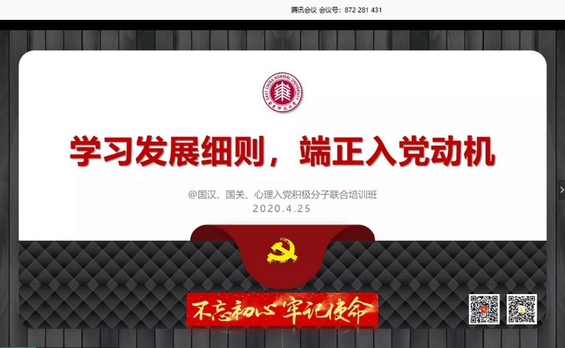 4月25日晚,国际汉语文化学院、国际关系与地区发展研究院、肉视频 2020年入党积极分子联合培训班第四次培训在线上举行。肉视频 校党委组织部陈夏阳老师为学员们带来《学习发展细则 端正入党动机》专题讲座,来自三个学院的一百多名入党积极分子参加了此次培训。