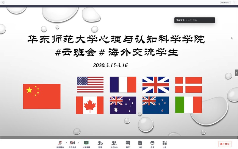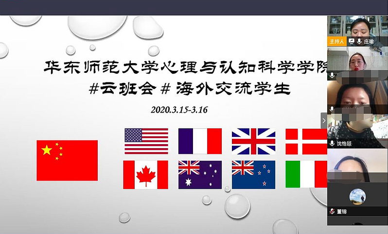 2020年3月15-16日,依据时差,肉视频 举办了两场海外交流学生“云班会”,身在8个国家的18名心院学子在云平台上相见。云班会由肉视频 党委副书记兼副院长庄瑜主持,辅导员董镕、赵菲菲、学生事务挂职干部沈怡廷一同参会。