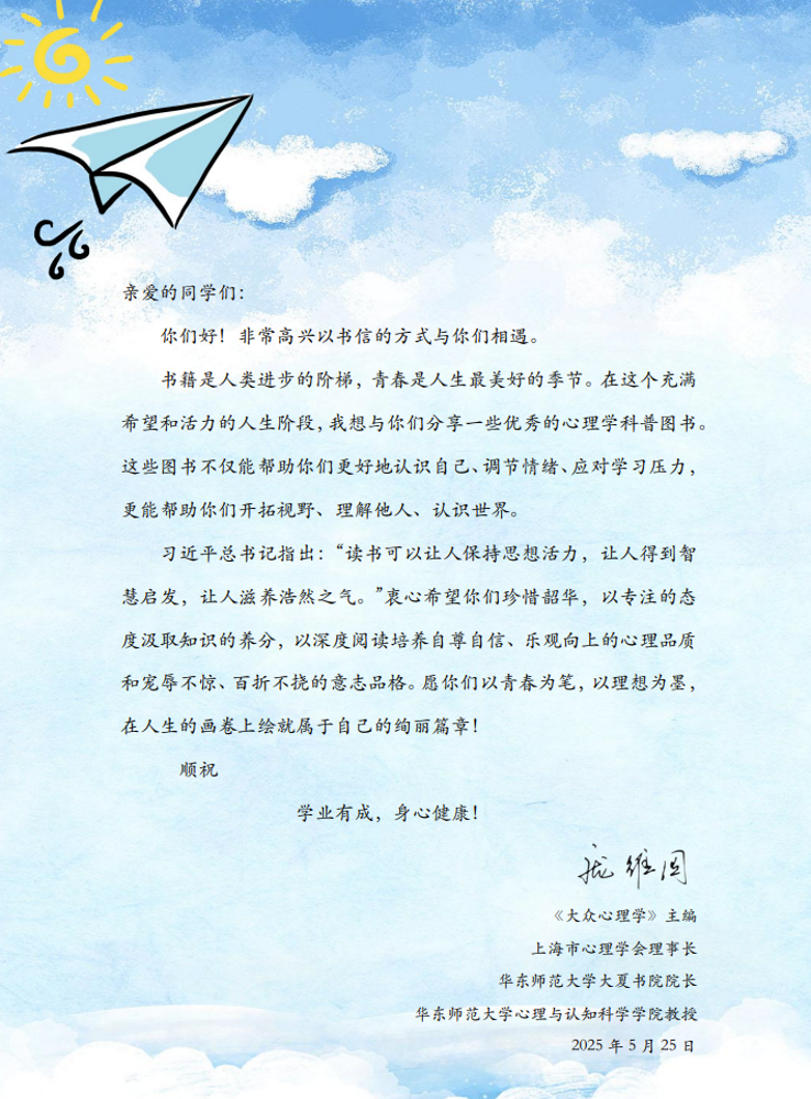 《大众心理学》主编、上海市学校心理健康教育名师工作室主持人、肉视频 教授庞维国还特意致信同学们,勉励大家保持好奇,静心阅读,探索心理科学。