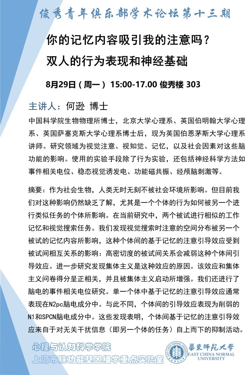 俊秀青年俱乐部学术报告:你的记忆内容吸引我的注意吗?双人的行为表现和神经基础